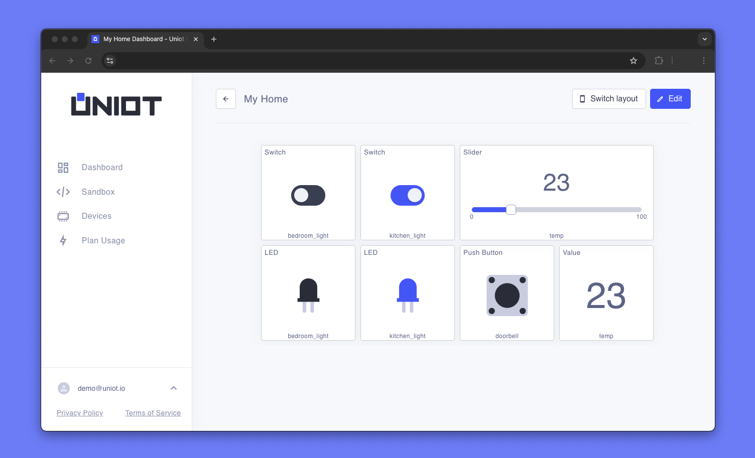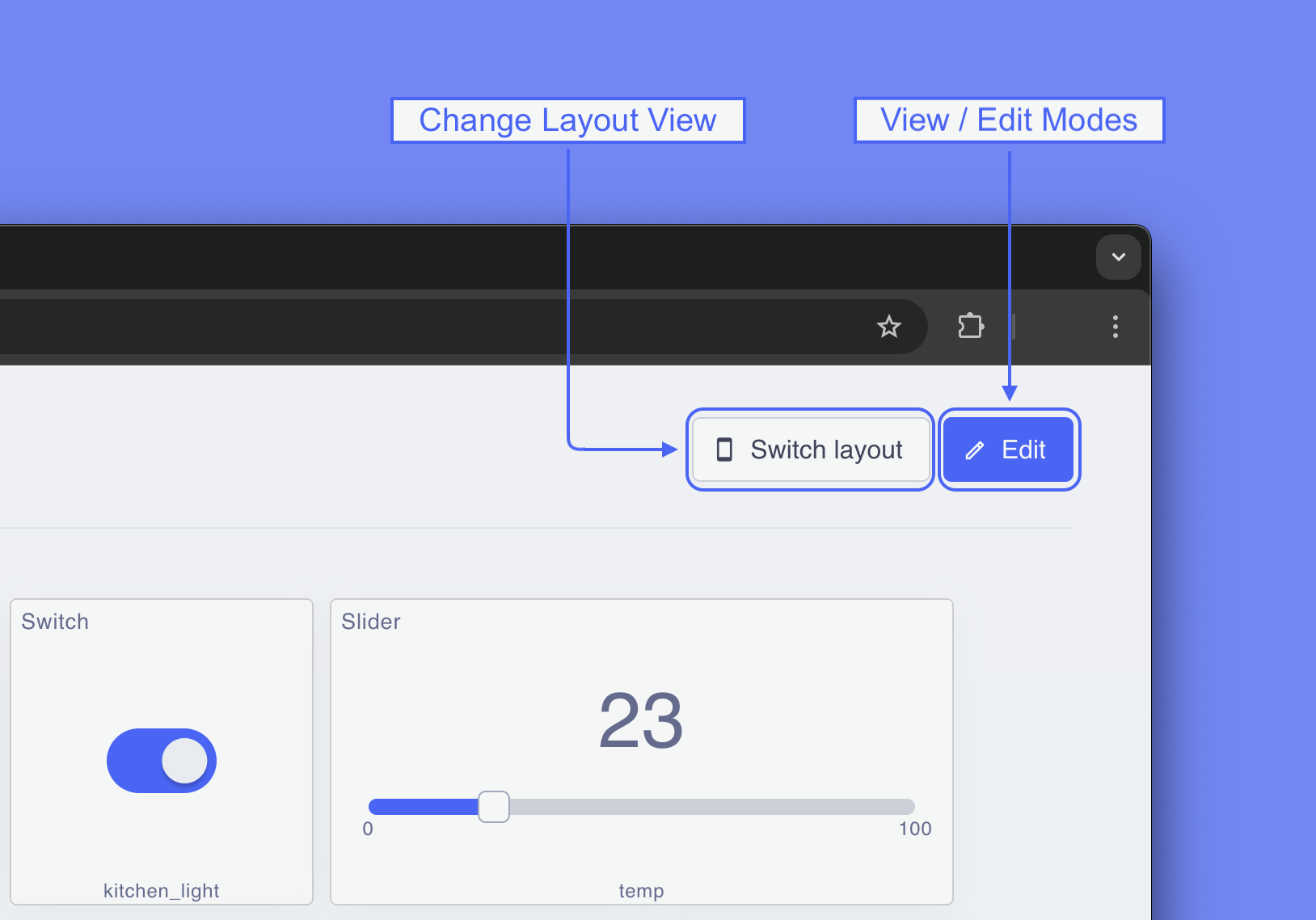 The main dashboard view displays your configured widgets arranged in a grid layout. From here, you can quickly switch between view and edit modes and access all device interactions in one place. The interface is designed to be intuitive - focus on your devices, not on learning complex UI patterns.