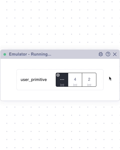 Custom primitives you define in your script are automatically generated as interactive components in the Emulator. Each user primitive displays its input parameters with current values and types, and allows you to configure what it returns to your script.